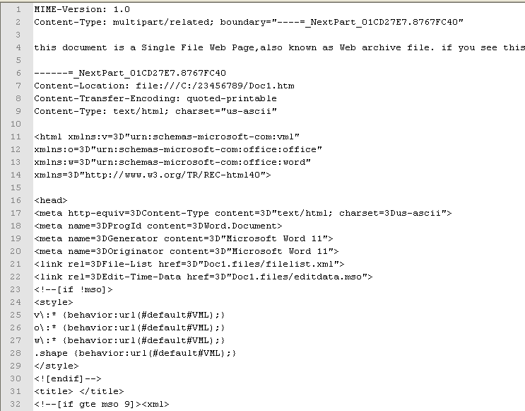 Anybody analysing a malicious Word document will be surprised at the first look of the content of the file. During further investigation, it was found that Microsoft Word support what is called a MIME HTML Web Archive. It was identified that the HTML code in turn invokes a known to be vulnerable control with data that triggers a Stack based Buffer Overflow in MSCOMCTL.OCX.